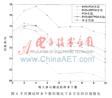由表1可以看出,在不同的训练样本条件下,本文提出的方法的识别效果明显高于参考文献中提出的其他几种方法,这主要是由于加入镜像信息后可以减小由于姿态变化对人脸识别的影响。从图3中的实验数据也可以看出SVD+2DPCA和SVD+(2D)2PCA方法在特征维数增大时,两种方法的识别效果差不多,但是都不如本文所提方法,而且由SVD+(2D)2PCA方法和本文方法的比较曲线可以得知,本文方法识别率的提高主要是依赖于人脸图像镜像信息的加入,而不是仅仅由于(2D)2PCA特征提取方法的选择。由图4可知,随着测试样本个数的增加,特别是PCA方法的识别率较低而且其稳定性较弱,与SVD+2DPCA以及SVD+(2D)2PCA方法相比,本文所提方法在保证识别率高于其他方法的同时,也表现出了较强的稳定性。