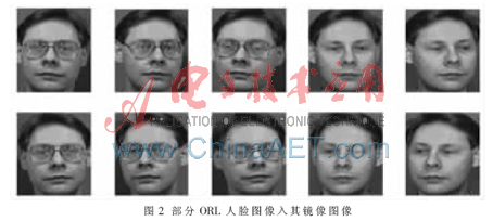 本实验所用人脸数据库为ORL人脸库,该人脸数据库由40人、每人分别由10幅大小均为112×92的256灰度级的正面人脸图像组成,这些图像是在不同时间、不同光照、不同表情和不同姿态下拍摄的。图2给出了ORL人脸数据库中的部分标准人脸图像及其镜像图像。