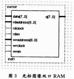硬件光标模块为LCD控制器设计带鼠标光标的显示功能,为系统开发中添加鼠标接口提供了方便。光标显示的实现方式有硬件方式和软件方式,软件方式比较复杂,且占用大量的CPU处理时间;硬件方式用硬件逻辑资源来实现,处理速度快,不占用CPU时间。硬件方式的设计思路是为光标的图像数据设置单独的存储空间(RAM)用以保存,当LCD屏幕需要对光标进行显示时,由硬件逻辑负责在输出光标和背景图像之间做出选择。而软件部分只需简单地修改光标坐标寄存器的值,就可以完成光标在屏幕上的显示操作。采用这种方法,大大提高了系统性能。硬件光标RAM模块是通过MegWizard Plug-In Manager编辑器生成的,最终生成的存储光标图像数据的双口RAM如图3所示。