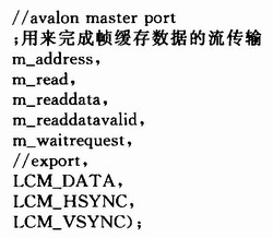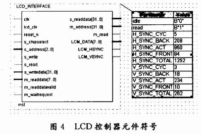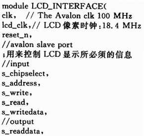 LCD_INTERFACE。它以IP核的形式存放在SoPCBuilder的组件库中供设计使用,把液晶显示控制器设计成Avalon总线的slave设备。由于该控制器是参数化的,可以很容易地修改TFT_LCD液晶的时序参数,具有很强的通用性。通过Terasic公司的TRDB_LTM彩色液晶显示开发板进行设计验证。TRDB_LTM采用Toppoly公司的TFT_LCD模块TD043MTEAl,4.3英寸屏。时序参数中,横向时序参数为:时钟频率(NCLK)33.2 MHz;横向有效数据为800点;H_LINE=1 056;Hsync_Blank=216;Hsync_Front_Porch=40。纵向时序参数为:纵向有效数据为480点;V_LINE=525;Vsync_Blank=35;Vsync_Front_Porch=10。