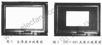 按上面的时序参数在SoPC系统中配置TFT_LCD液晶IP核后,设置屏幕背景为白屏,并在上面用黑线画一个矩形,显示结果如图5所示。如果将时序参数中的数据做如下调整,将横向有效显示数据设置为480点,纵向有效显示数据设置为360点,做同上的验证,显示结果如图6所示。由这两个图可见,该控制器具有很好的通用性。