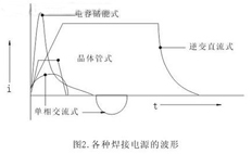 电阻点焊中,焊接电流I、通电时间T非常重要,其波形、稳定性直接影响焊接效果,而I与T的特性是由焊接电源本身决定的,目前,焊接电源主要有单相交流式、电容储能式、逆变式和晶体管式等4种。几种焊接电流的波形见图2,各种电阻点焊电源特点见表1。