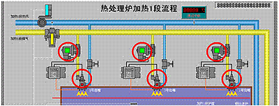 该热处理加热监控系统使用了4台AI-301ME5I5I5I5I5I5共37个I/O点,主要控制和检测冷却风机,加热器,煤气喷嘴电磁阀,进水电磁阀,煤气浓度报警器等多个开关量输入输出设备。