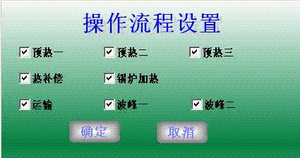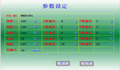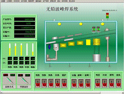 实现对无铅波峰焊系统工艺流程的操作,工艺参数的实时监视。包括各工艺环节的打开关闭,各温度值的实时检测,报警。PCB板型号,产量,设备运行时间等参数的显示。