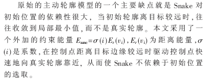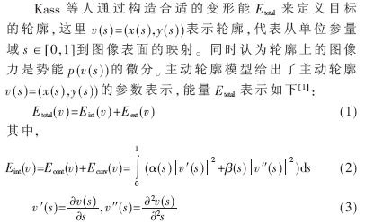 主动轮廓模型融合了分割过程的三个阶段,使得检测到的目标边界是一光滑连接的曲线。其主要思想是定义一个能量函数,在Snake由初始位置向真实轮廓逐渐靠近时,寻找此能量函数的局部极小值,即通过对能量函数的动态优化来逼近目标的真实轮廓。这样,图像边缘提取问题就转变成为一个最优化问题,最优化的目的就是获得最小化的主动轮廓模型的能量函数。Snake模型的引人之处在于,它对于范围广泛的一系列视觉问题给出了统一的解决方法[10]。