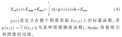 外部能量Eext吸引Snake到显著的图像特征,包括表示图像作用力产生的能量Eimage和表示外部约束作用力产生的能量Esanc。图像力表示轮廓点与图像局部特征的吻合情况,约束力是各种人为定义的约束条件,通常不考虑,将其置为0。