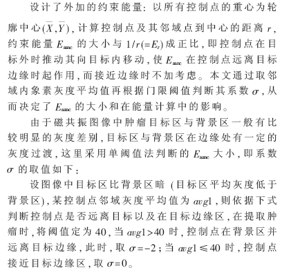 根据提取肿瘤目标的灰度特性,结合控制点灰度统计信息,判断归属于背景区还是边缘区以相应地确定外部约束能量Esanc的系数?滓的大小,从而改变外部约束能量的大小,快速地接近目标轮廓。
