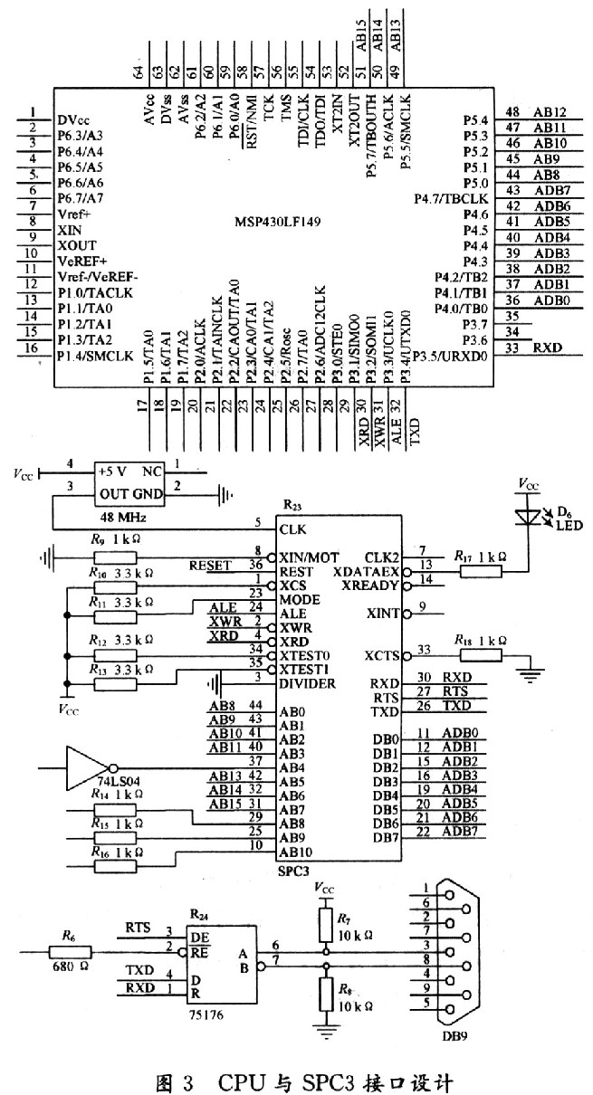 考虑到Profibus对速率的要求本文选用高速率,低功耗的16位MSP430单片机,采用Intel工作方式。CPU与SPC3接口电路如图3所示。对于MSP430单片机而言,SPC3相当于它扩张的一个外部RAM。单片机可以通过访问外部RAM的方法访问SPC3的寄存器。RS 485驱动器的一端与SPC3相连,另一端通过9针D型插头与总线相连。RS 485驱动器选择SN75SLS176来满足高速的数据通信。