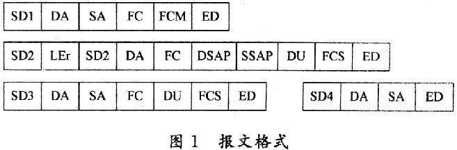 Profibus-DP数据编码采用异步不归零制,传输线的空载电平为“1”。为了避免数据传输中发生冲突而导致数据丢失,在每个请求报文发送前必须保证33位(同步时间)的空载状态。在单个字符间所有数据传送时没有间隙,即无缝。各种报文的格式如图1所示。
