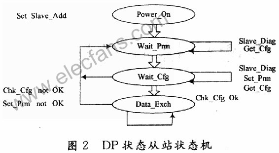 图2为DP从站状态机的简单图示。各种椭圆表示不同的状态,带箭头的连线表示状态间的转换,连线上的文字表示状态转换所需满足的条件。