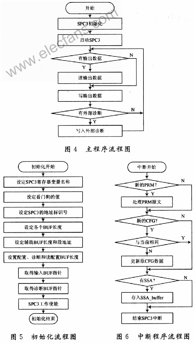 主程序流程图如图4所示,在SPC3正常工作之前,需要进行初始化,以配置需要的寄存器,包括设置协议芯片的中断允许,写入从站识别号和地址,设置SPC3方式寄存器,设置诊断缓冲区,配置缓冲区,地址缓冲区,初始化长度,并根据以上初始值得出各个缓冲区的指针和辅助缓冲区的指针。根据确定输出缓冲区、输入缓冲区及指针,初始化流程图如图5所示,初始化包括:SPC3硬件复位、硬件模式、设置SPC3中断屏蔽寄存器、SPC3内部看门狗、设备标识号、缓冲区初始化。