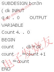 oo0为经电平转换后接近开关输出的信号。当oo0为低电平时,说明泵1未动作,封锁三端与门,时钟信号clki无法通过,计数器bcn3n不计数。同理,当aa4为高电平时,亦封锁三端与门(至于aa4如何变化及作用下文有介绍)。故当oo0为高、aa4为低时,clki接通计数器CLK端。当oo0和clr端任意一个为低时,计数器清零。计数器bcn3n由MAX+PLUSII的文本编辑器编辑,其文本如下: