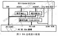 采用了ISA插槽中的8位数据线、10位地址线、读写控制线IOW和IOR以及电源线,并假设使用390H、391H、392H三个端口。当PC机要访问某一地址单元时,首先通过390H端口将低8位地址送到数据总线上。此时由PC-AB送出的390H信号和IOW信号经解码电路输出一个锁存脉冲到锁存器(L),将此低8位地址锁存;然后通过391H端口将高4位地址送到数据总线上,此时由PC-AB送出的391H信号和IOW信号经解码电路输出一个锁存脉冲到锁存器(H),将此高4位地址锁存;最后通过392H端口进行读写,只要PC-AB上出现392H信号,解码电路就输出一个低电平到双口RAM的/CS,再根据相应的读写控制信号就能进行读写操作。