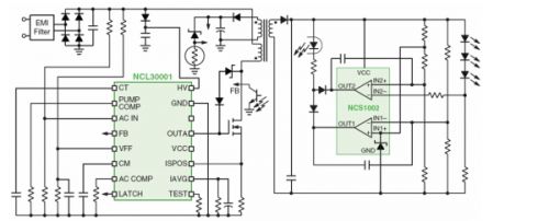 NCL30001就是一种单段式控制器,集成了功率因数校正和隔离型降压DC-DC转换电路,帮助减少元件数量、降低系统成本,支持更高的LED电源总体能效。NCL30001提供稳流恒流来直接驱动LED,省下了LED光条中集成的线性或DC-DC转换(图1)。安森美开云棋牌官网在线客服的设计笔记AND8427中描述了一种基于NCL30001单段连续电流模式(CCM) PFC控制器和NCS1002次级端恒压恒流(CVCC)控制器的LED电源,适合街灯等区域照明应用。