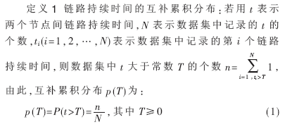 链路持续时间的互补累积分布p(T)用来反映数据集中两个节点间链路持续时间取值大于某个常数T的概率。