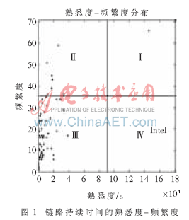 定义2 熟悉度-频繁度:以数据集中节点j与节点k直接通信的次数fj,k表示节点间的通信频度。节点j与节点k在fj,k次直接通信中链路持续时间的累加和表示两节点的亲密度,和值越大,亲密度越高,也表明两个节点的社会关系越紧密。为了研究节点间的组织关系特征,计算数据集中所有节点对的亲密度和通信频度,画散点图,用x轴表示亲密度,y轴表示通信频度,便得到节点间的熟悉度-频繁度,如图1所示。