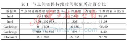 RAWDAD组织提供的Haggle项目的3个数据集,分别在Intel研究合作实验室、剑桥大学的计算机实验室、Grand Hyatt Miami的IEEE会议环境下采集人携带无线设备的移动数据。为方便起见,3个数据集分别简称为Intel、Cambridge和Infocom05。实验所用的无线设备分为iMote设备和外部设备两种,采集了携带iMote设备节点之间、携带iMote设备节点与携带外部设备节点之间在彼此通信覆盖范围内的链路持续时间,而没有采集携带外部设备节点之间的链路持续时间。为了提高实验分析结果的有效性和正确性,只考虑携带iMote设备节点之间的链路持续时间数据。