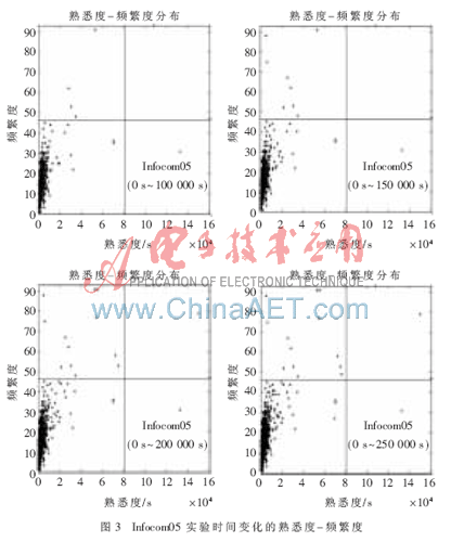 为分析节点组织关系特征与时间的关系,考察实际数据集中不同采样时间长度内的节点熟悉度-频繁度。由于3个实际数据集的熟悉度-频繁度具有相同特性,不妨以Infocom05数据集为例,取时间长度分别为100 000 s、150 000 s、200 000 s、250 000 s,得到节点的熟悉度-频繁度,如图3所示。可以看出,不同统计时间内四类关系节点的比例基本维持不变,弱关系节点分布密集,强关系节点比例很少。