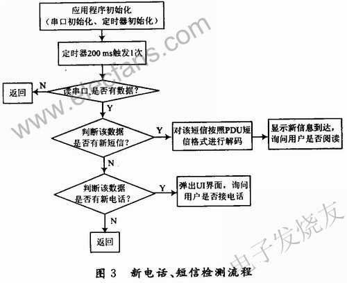 新电话、新短信的检测流程如图3所示,应用程序初始化需要对GSM/GPRS通信模块与应用处理器之间的接口进行初始化,此外还要定义1个200 ms触发的定时器。系统初始化完毕之后,定时器触发开始读串口数据进行判断。当串口无数据时,等待下一次定时器出发;当串口有数据时,将串口的数据进行判断;当数据中有新短信提示符时,按照PDU短信的解码格式对该短信进行解码,并调用UI界面提示用户新短信到达,询问用户是否阅读;当数据中有新电话提示符时,调用UI界面,询问用户是否接听。