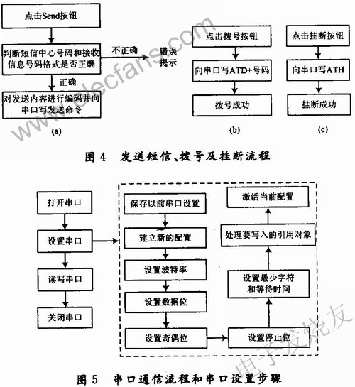 当需要发送短信或拨号时,应用程序流程如图4所示。当用户调用发信界面编辑好短信,并输入完收信方,点击发送钮时,应用程序首先判断短信中心号码和接收信息号码是否正确,若不正确,提示用户错误;若号码和号码格式均正确,便对要发送的短信内容按照进行PDU短信格式进行编码,并向串口写AT命令以便将该短信发送出去。拨号和挂断电话的流程很简单,只需要向串口写入ATD+所拨号码以及ATH就可,当拨号错误时,提示用户拨号错误。