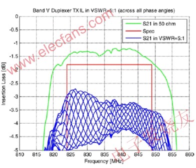 图3:当手机的窄带双工或接收滤波器没有端接到其特征阻抗时,在通带中也会出现纹波。本例中,VSWR为5:1的阻抗失配使插入损耗大幅度增加。