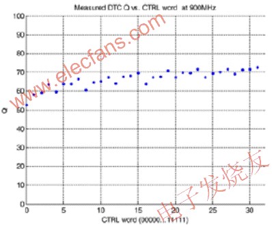 图7:DuNE DTC器件的品质因数实测结果,在900MHz时其Q值为60-70。