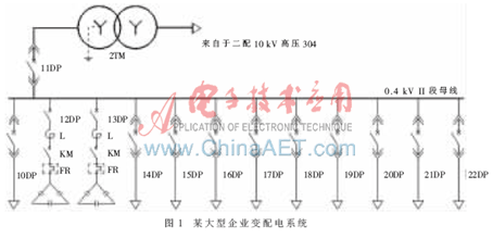 某大型企业的10/0.4 kV变配电系统是由第一、第二两个变电所组成。两个变电所都是采用两台变压器分列运行方式,如图1所示。第二变电所的二号变压器由10 kV高压304断路器控制,0.4 kV低压由11DP输出总屏控制,10DP为与一号变压器输出的I段母线的联络开关,12DP、13DP为电容补偿屏,14DP~22DP为低压馈电线路控制屏。
