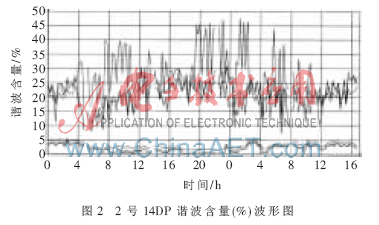 图2所示为14DP供电线路的高次谐波电流百分比含量曲线图(上曲线)。从零时至第二天零时的一昼夜中,高次谐波电流含量一般都在10%~50%之间徘徊,而且三相中以B相含量为最高。高次谐波电压百分比含量(下曲线),多次电压突破5%,达到6%的含量。
