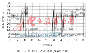 图3所示为15DP供电线路的高次谐波电流百分比含量曲线图(上曲线)。从零时至第二天零时的一昼夜中,只要线路有负荷就有谐波电流的存在,最少都有5%以上的含量,负荷高峰时可达30%~45%。高次谐波电压百分比含量(下曲线),多次电压突破5%,达到6%的含量。