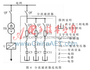 在大容量“谐波源”(如大型晶闸管整流器)与电网连接处,装设分流滤波器,使滤波器各组R-L-C回路分别对需要消除的5、7、11等次谐波进行调谐,使之发生串联谐振。由于串联谐振时阻抗极小,从而使这些谐波电流被它分流吸收而不至于注入公用电网。分流滤波器接线图如图4所示[5]。