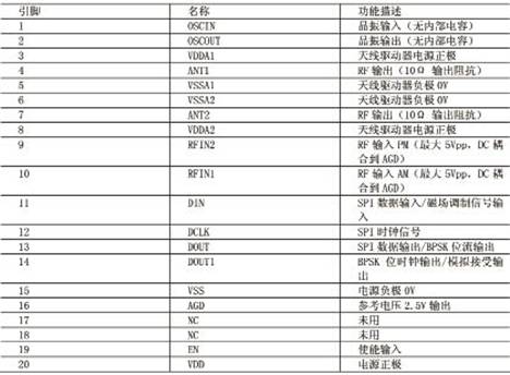 RFIN1和RFIN2是该IC接收链上的两个输入引脚,它们被EM4094用来解调收发器送过来的数据流,其引脚 上的电压必须设定在GND和VDD之间,这两个解调输入必须具有相同的性能和呈现出相同的灵敏度。配合一个外部匹配阻抗电路,这两个输入端可用于解调输入的相位或幅度调制信号。未使用的输入脚应当通过一个10nF的电容接至模拟地。输入引脚的高灵敏度使得读卡器即便在电子标签的最小电源级别上仍能有较远的读取距离。
