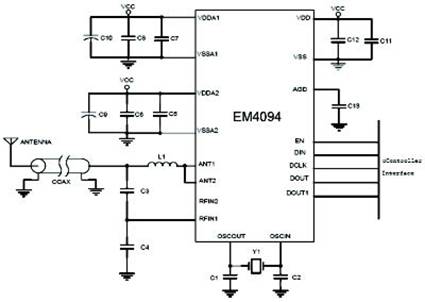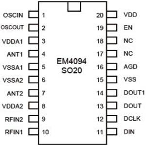 ANT1和ANT2为天线驱动器的两个输出端,它们可同相或反相驱动,这使得有可能用不同的方式连接读卡器天线,以及依据所选择结构的不同产生四个不同功率等级的天线。EM4094还可与一个远端天线一起使用,此时EM4094的输出阻抗必须与通信线路阻抗相匹配。