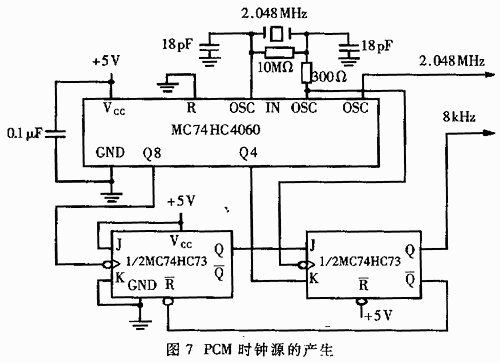 在图6中,8kHz、2.048MHz时钟源可用Motorola的MC74HC4060来产生。具体实现如图7所示。