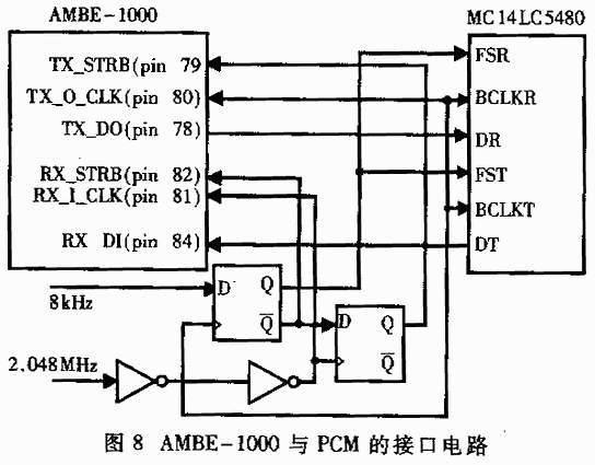 AMBE-1000的电路分三个部分:与PCM接口部分;芯片控制引脚设置部分;压缩数据输入、输出部分。