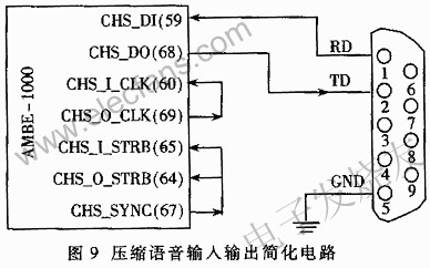 压缩语音数据的输入输出电路主要是指传输接口的设置电路以及与标准串口DB-9的连接电路。本系统传输接口的设置为主动、串行、帧格式模式,也就是CH_SEL2、CH_SEL1、CH_SEL0(98、99、2引脚)设置为0、1、0。图9为芯片与DB-9的简化连接电路图。