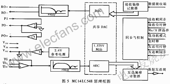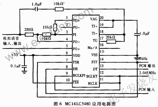 在图5中,RO+、RO-和TI+、TI-分别是PCM模拟语音信号的差分输出和输入;PI、PO+、PO-用来放大模拟信号以驱动模拟语音设备;同步控制部分主要用于控制帧同步和比特位同步,控制引脚主要用于μ/A律的选择和低功耗模式的选择。