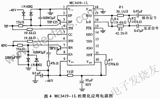 图4是MC3419-1L的一个简化应用电路。在图4中,TIP125和TIP111都是电流馈电功放输出管;-48伏电源与用户线之间的二极管桥和电阻主要起过压过流保护作用,电容起防冲击作用;接入CC引脚的外接阻容元件主要用于抑制工频共模干扰;MC3419-1L与PCM的连接部分为平衡网络电路。