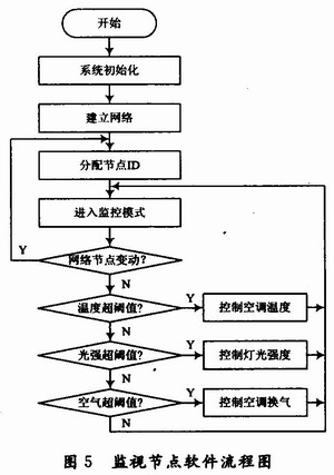 监视节点既要完成ZigBee网络的建立和维护,包括新节点的加入和原有节点的退出管理;也要读取并处理监测节点的信息:读取温度、光敏、空气质量传感器的信息并作出相应的反应;还要发送控制命令到控制节点:根据通过传感器读取的居室信息控制相应的家电。监测节点的软件流程图如图5所示。