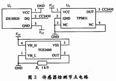 监测节点的硬件结构采用CC2430作为微处理器,采用DSl8B20作为温度传感器、TPS851作为光敏传感器、TGS2600作为空气质量传感器探测家居环境情况。检测节点电路图设计如图3所示。
