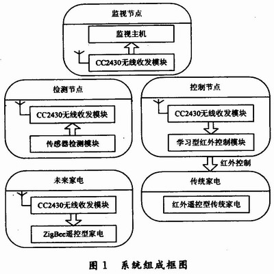 系统组成如图1所示,监控系统主要包括监视节点、传感器检测节点、红外中转控制节点。监视节点能够建立并维护ZigBee网络,同时负责与监控主机的通信。一旦监控主机接入远程网络,该系统即可升级实现远程实时监控。传感器检测节点负责采集家庭光照、温度、空气质量等环境信息。红外中转控制节点可根据采集的信息通过红外线实时控制空调、灯光等传统红外型家电,而对于未来的ZigBee控制型家电,通过CC2430模块便可实现兼容控制。