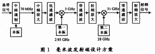 本设计要将70 MHz的信号上变频到31 GHz输出,考虑到经过功率放大后的强发射信号泄漏对发射机性能指标将造成影响,并且此时采用滤波器来提取输出信号非常困难,代价昂贵,因此采用两次变频的方法,将中频信号调制后上变频到毫米波频段。设计方案如图1所示。