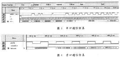 信源首先经串并转换将输入的单路串行数据转换为双路并行数据,经过串并转换产生的数据速率减半,再经过“差分编码”转换为相对码,通过并口送入 AD9857进行绝对调相。在FPGA与AD9857串口通信中,当CS为低电平时,开启AD9857的串口,FPGA通过SDIO将控制字发送给 AD9857,设置AD9857的工作方式,当CS为高电平时,关闭AD9857的串口,串口通信仿真如图3所示。在FPGA与AD9857的并口通信中,当TXEN-ABLE为高电平时,通过PDCLK读取FPGA中的14位并行数据送入AD9857,当TXENABLE为低电平时,关闭AD9857 的并口,并口通信仿真如图4所示。