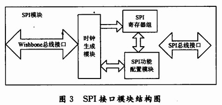 图3是本文无线通信系统中SPI模块的结构图,该系统中的SPI主要由时钟生成模块,SPI寄存器组,SPI功能配置的模块组成,并且通过Wishbone总线与控制器相连,具体设计如下: