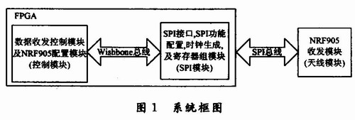 如图1所示即为本无线系统的整个构架,由控制模块,SPI模块以及天线模块构成。其中对SPI模块的配置由控制模块通过Wishbone总线来完成,并且对天线模块的配置,模式转换,收发数据等操作均由控制模块通过SPI总线来完成。下面将就各个部分进行说明。