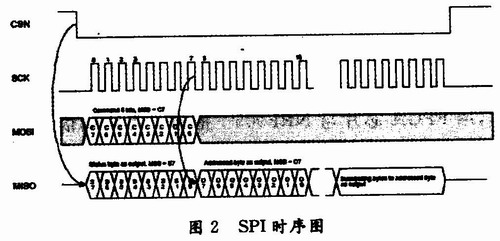 图2为NRF905的SPI接口的时序图,由此本文设计的SPI工作模式是在CPOL=O,CPHA=O这种时序下。
