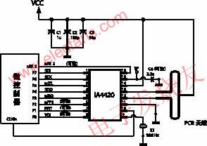 图2是IA4420的典型应用原理图,可做为无线双向防盗系统的参考电路,主要包括一个IA4420芯片和单片机(编解码器)。从图中可以看到,该电路的外围元件少,仅有一个基准晶体及几个无源器件,没有调试部件,天线用微带天线直接设计在线路板上,这给研制及生产带来了极大的方便。无需电感等元器件,晶体X1需要用高稳定晶体,电容选用高稳定贴片元件,如NPO高稳定电容,以确保性能稳定。该电路采用跳频发射,将可靠性提高了3倍。