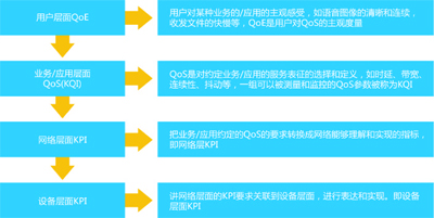 端到端性能评估体系:在端到端优化中,首先要解决的问题是:如何搭建基于用户感知QoE(QualityofExperience)的端到端性能评估体系,将用户感知转化为应用层、业务层和网络层中各项可量化、可测量的指标。也就是说,根据分析和优化,将用户感知折射到业务质量模型,再映射到网络层性能指标,从而为用户提供更好的业务使用体验。因此,首先对QoE、QoS(KQI)、KQI、KPI的关系进行梳理是必要的,QoE、QoS与KPI的关系如图1所示。