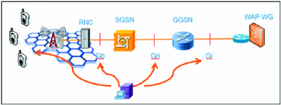 业务性能的分析与优化内容包括:对SP服务器连接性、稳定性进行分析优化,对网关吞吐量、丢包率和数据包重传率进行分析优化,对于WAP浏览业务主要性能首页显示时长、首页访问成功率、刷新时长和刷新成功率进行优化。这些优化都需要通过对多个接口数据进行采集,进行协同分析,快速定位问题,提升业务质量,如图3所示。