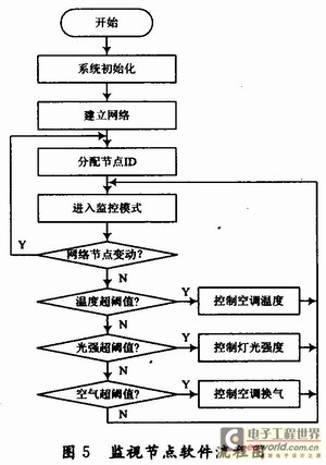 监视节点既要完成ZigBee网络的建立和维护,包括新节点的加入和原有节点的退出管理;也要读取并处理监测节点的信息:读取温度、光敏、空气质量传感器的信息并作出相应的反应;还要发送控制命令到控制节点:根据通过传感器读取的居室信息控制相应的家电。监测节点的软件流程图如图5所示。