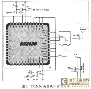 CC2430是一颗真正的系统芯片(SoC)CMOS解决方案,它结合一个高性能2.4 GHz DSSS射频收发器核心和一颗小巧高效的8051控制器。图2为CC2430的一种典型应用电路。该电路使用了一个非平衡天线,这样可使天线性能更好。电路中的非平衡变压器由电容C341和电感L341,L32 1,L331以及一个PCB微波传输线组成,整个结构满足RF输入/输出匹配电阻50 Ω的要求。32 MHz的晶振电路由1个32 MHz的石英谐振器(XTA-L1)和2个电容(C191和C211)构成;32.768 kHz的晶振电路由1个32.768 kHz的石英谐振器(XTAL2)和2个电容(C441和C431)构成。